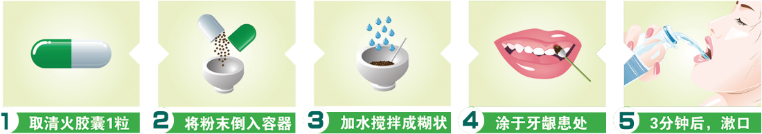 4.然后用小壓片把拌成糊狀的清火膠囊均勻涂抹在患處,保持患處藥物停留處3分鐘,避免藥物流動影響效果;5.3分鐘后,用飲用水漱口,清洗干凈即可。